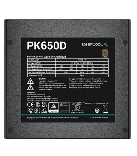 DeepCool PK650D. Puissance totale : 650 W, Tension d'entr?e AC : 100 - 240 V, Fr?quence d'entr?e AC : 50/60 Hz. Connecteur carte m?re : 20+4 broches ATX, Longueur du c?ble d'alimentation carte m?re : 50 cm, Longueur du c?ble d'alimentation SATA : 400,500,600 mm. But : PC, Certification 80 Plus : 80 PLUS Bronze, Type de roulement : HDB. Couleur du produit : noir, Diam?tre du ventilateur : 12 cm, Nombre de ventilateurs : 1 ventilateur. C?bles fournis : AC Performance : - Puissance totale : 650 W - Tension d'entr?e AC : 100 - 240 V - Fr?quence d'entr?e AC : 50/60 Hz - Courant combin? (+3.3V) : 110 W - Courant combin? (+12V) : 648 W - Courant combin? (+5V) : 110 W - Courant combin? (-12V) : 3,6 W - Courant combin? (+5Vsb) : 12,5 W - Max. Courant de sortie (+3.3V) : 20 A - Max. Courant de sortie (+12V) : 54 A - Courant de sortie max (+5V) : 20 A - Max. Courant de sortie (-12V) : 0,3 A - Max. Courant de sortie (+5Vsb) : 2,5 A - Temps de maintien : 16 ms - Rendement : 85 - Caract?ristiques de protection de l'?nergie : Surintensit?, surcharge, surtension, surchauffe, court-circuit, sous-tension Connexions et interfaces : - Connecteur carte m?re : 20+4 broches ATX - Nombre de connecteurs Molex 4 broches : 1 - Longueur du c?ble d'alimentation carte m?re : 50 cm - Nombre de connecteurs d'alimentation SATA : 1 - Longueur du c?ble d'alimentation SATA : 400,500,600 mm - Longueur du c?ble d'alimentation p?riph?rique (Molex) : 400,500,600,700 mm - Connecteur d'alimentation EPS (4+4 p?les) : Oui - Nombre de connecteurs d'alimentation PCI Express 6+2 broches : 2 - Longueur du c?ble d'alimentation PCI Express : 62 cm - Connecteur d'alimentation ATX (20+4 pins) : Oui - Type de c?ble : Non-modulaire Puissances : - Objet : PC - Certification 80 Plus : 80 PLUS Bronze - Version ATX : 2.4 - Type de roulement : HDB - Dur?e moyenne entre les d?faillances (MTBF) : 100000 h Conception : - Couleur du produit : Noir - Diam?tre du ventilateur : 12 cm - Nombre de ventilateurs : 1 ventilateur - Interrupteur marche/arr?t : Oui Conditions de fonctionnement : - Temp?rature de fonctionnement : 0 - 40 ?C Contenu de la livraison : - C?bles fournis : AC Poids et dimensions : - Largeur : 150 mm - profondeur : 140 mm - hauteur : 86 mm Donn?es d'emballage : - Type d'emballage : bo?te. ...