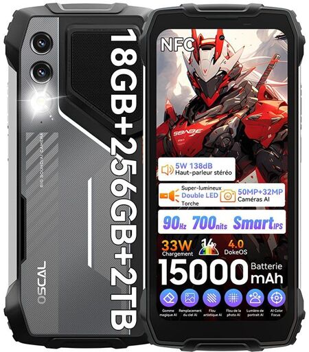 Oscal Téléphone Portable Incassable,Téléphone Portable Robuste Haut-parleur puissant de 5 W et une lampe torche à double faisceau ultra-lumineuse--Conquérez le jour et la nuit avec un monstre de puissance de 15000 mAh et un écran lisible à la lumière du jour de 700 nits--Chaque instant est perfectionné avec des caméras 50 MP + 32 MP et un tout nouveau éditeur de photos alimenté par Al--Ultra-fluide avec Octa-core Helio G81 et 18 Go de RAM et 256 Go de ROM 2 To extension TF ...