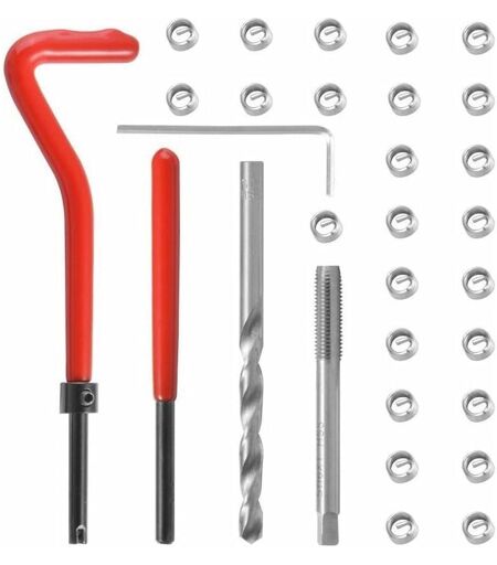 Ce kit de réparation de filetage permet à M6 de réparer les filetages endommagés ou usés. en acier à haute vitesse et poignée en plastique de couleur rouge, robuste et durable dans l'utilisation. Il peut être utilisé dans la réparation quotidienne, la réparation de voiture, la machine de forage, etc. Idéal pour la réparation de moteur et d'autres applications automobiles, pour la restauration des fils endommagés. Le kit de réparation de filetage, y compris les inserts filetés, le foret, le taraudage, l'installation d'insert, l'outil de rupture de cosse, vous permettent d'avoir une expérience de réparation en douceur. ...
