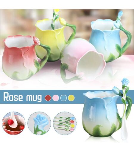 Tasse ¿¿ caf¿¿ en c¿¿ramique en ¿¿mail de Style Pastoral europ¿¿en, tasse cr¿¿ative en forme de fleur de Rose 3D, tasses ¿¿ th¿¿ pour le petit d¿¿jeuner, pour l'eau et le lait, avec cuill¿¿re ...
