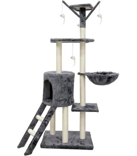 Moyen arbre à chat JIPSY avec niche et souris Référence : ALC11 Caractéristiques principales : Couleur : Gris Dimensions : 79 x 34 x 138 cm Structure : 3 plateformes 4 souris 1 niche 1 perchoir 1 escalier Poteaux à griffer Composition : Tige en sisal de diamètre 7 cm Tissu court en peluche de 220 g/m² Dimensions des éléments : Plateaux inférieurs : 49 x 34 cm Hamac : 30 x 30 cm Plateforme supérieure : 20 x 20 cm 2ème plateforme : 25 x 38 cm 3ème plateforme : 25 x 25 cm ...