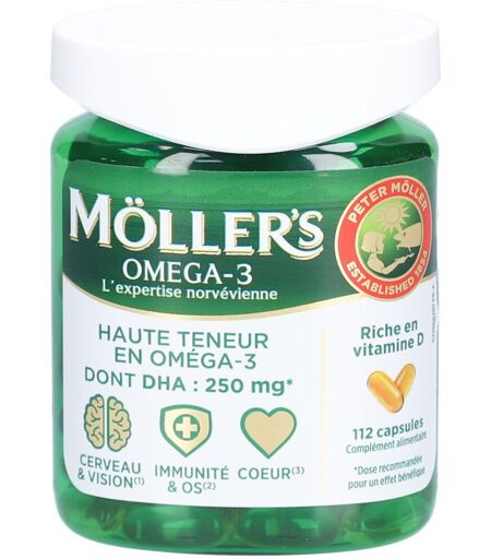Complément alimentaire à utiliser dans le cadre d’une alimentation variée, équilibrée et d’un mode de vie sain.Möller's Omega-3 112 Capsules est un complément alimentaire qui contient une combinaison unique d'acides gras oméga 3 d'origine marine et de vitamines D, A, E qui aident à rester en bonne santé :le DHA contribue au fonctionnement normal du cerveau et au maintien d'une vision normale. L'EPA et le DHA contribuent à la fonction cardiaque normale ;la vitamine D contribue au maintien d'une ossature normale et au fonctionnement normal du système immunitaire.IngrédientsHuile de POISSONS concentrée dosée en oméga 3, Gélatine d'origine bovine, Humectant : Glycérol, Acétate de DL-alpha-tocophéryl (Vitamine E), Antioxydant : Extrait riche en tocophérols, Arômes, Palmitate de Rétinyl (Vitamine A), Cholécalciférol (Vitamine D).Allergènes : Poisson.Valeurs nutritionnellesApportsPour 1 capsule% AR*Pour 2 capsules% AR*Oméga 3325 mg-650 mg-Dont EPA100 mg-200 mg-Dont DHA125 mg-250 mg-Vitamine D7,5 µg150%15 µg300%Vitamine A125 µg15%250 µg31%Vitamine E5 mg41%10 mg83%*Apports de Référence.Conseils d'utilisationAdultes et enfants à partir de 10 ans : 2 capsules par jour à avaler avec un verre d'eau.Enfants entre 6 et 9 ans et capables d'avaler les capsules : 1 capsule par jour à avaler avec un verre d'eau.Ne pas dépasser la dose journalière indiquée.Précautions d'emploiIl est recommandé aux femmes enceintes et allaitantes de consulter un professionnel de santé avant toute complémentation.Les compléments alimentaires doivent être utilisés dans le cadre d'un mode de vie sain et ne doivent pas être utilisés comme substituts d'un régime alimentaire varié et équilibré.Tenir hors de portée des enfants.À conserver à l'abri de la lumière dans un endroit frais et sec.Poids net112 capsulesAdresse du FabricantOrkla group Drammensveien 149 Oslo, Norvège ...