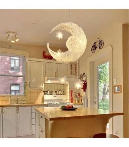 Lampe à Suspension Lune et étoile Moderne. Croissant de lune avec les étoiles entourées, faites un salon calme et tranquille pour votre enfant. Spécification: Corps de lampe Matériel: Aluminium. Dimensions: Diamètre: 40cm / 15.74; Longueur du cordon: 120cm /47.24 Nombre d'ampoules: 5 Base de l'ampoule: G4 ; Puissance de la lampe: 20W maximum , Puissance: 5x 3W; Tension: AC110V ~ 240V Le forfait comprend: 1 x Lampe pendentif La couleur de la lampe est déterminée par la petite ampoule G4. Vous pouvez également acheter de petites ampoules dans d'autres couleurs. Un grand cadeau pour votre famille, amis, amants et etc. Parfait pour la maison, salon, chambre à coucher, salle à manger, couloir, cuisine, bureau, studio, restaurant, hôtel, bibliothèque, salle de réunion, salle de montre, magasin, fenêtre, etc. ...