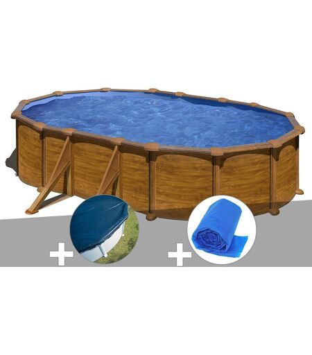 Gre Kit piscine acier aspect bois Gré Mauritius ovale 5,27 x 3,27 x 1,32 m + Bâche hiver + Bâche à bulles