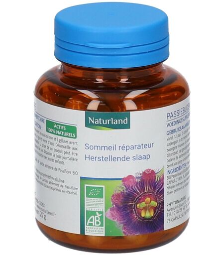 Complément alimentaire à utiliser dans le cadre d’une alimentation variée, équilibrée et d’un mode de vie sain. COMPLÉMENT ALIMENTAIRE. La passiflore favorise la relaxation et vous aide à retrouver un sommeil réparateur. Composition: Poudre* de partie aérienne de Passiflore BIO (Passiflora incarnata). GÉLULE 100% VÉGÉTALE : Hydroxypropylméthylcellulose. *Poudre obtenue par cryobroyage de parties aériennes de Passiflore titrées au minimum à 1,5% de flavonoïdes totaux (exprimés en vitexine). Valeurs nutritionnelles: Pour 4 gélules % AJR* Poudre de partie aérienne de Passiflore 1120 mg *Apport journalier de références Conseil d'utilisation: À partir de 12 ans. 2 gélules avant le repas du soir et 2 gélules avant le coucher à prendre avec un grand verre d’eau. Précautions d'emploi: Déconseillé aux femmes enceintes ou allaitantes. La prise de ce produit peut être suivie d’une baisse de vigilance. Ne pas dépasser la dose journalière recommandée. Ne pas laisser à la portée des jeunes enfants. À partir de 12 ans. Poids net: 27 g = 75 gélules Fabricant: LHS-NATURLAND ZI - 1re avenue - 9e rue 06511 Carros Cedex ...