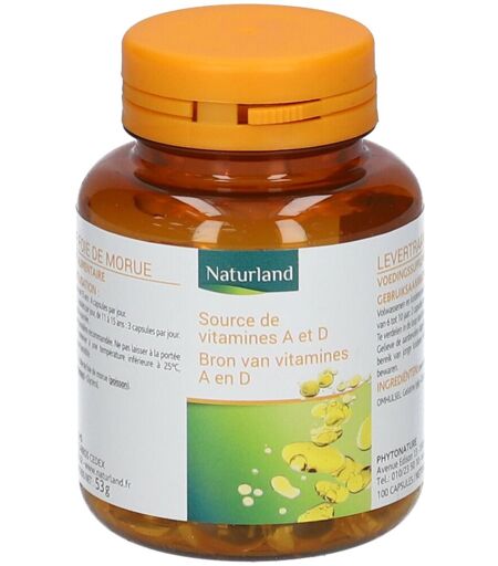 Complément alimentaire à utiliser dans le cadre d’une alimentation variée, équilibrée et d’un mode de vie sain.L’huile de foie de morue est une source de vitamine A et D. La vitamine A soutient le métabolisme normal du fer. La vitamine D contribue à la croissance osseuse chez les enfants et au maintien d’une ossature normale chez les adultes et les personnes âgées.L’apport journalier de 250 mg de DHA aide à maintenir de bonnes fonctions cérébrales, telles que les fonctions cognitives.L'huile de Foie de Morue est extraite du foie de la morue, un poisson de mer qui vit principalement dans les eaux froides.Saviez-vous que l’huile de Foie de Morue, redoutée par une génération d’enfants du fait de son goût désagréable, était parfois incluse dans les rations militaires des soldats de la Seconde Guerre mondiale en raison de ses propriétés nutritives ?IngrédientsHuile de foie de morue (POISSON). ENVELOPPE : Gélatine (POISSON) - Glycérol.Allergènes : Poisson.Valeurs nutritionnelles Information nutritionnelle moyenne(Pour 1 capsule) Ingrédient Quantité % VNR* Huile de foie de morue 400 mg- dont EPA 33 mg- dont DHA 48 mg - dont Vitamine A 120 µg RE 15% dont Vitamine D30,88 µg18% *VNR = Valeurs Nutritionnelles de Référence Conseils d'utilisationAdultes et enfants de plus de 15 ans : 4 capsules par jour. Enfants de 6 à 10 ans : 2 capsules par jour, de 11 à 15 ans : 3 capsules par jour. À répartir tout au long de la journée.Précautions d'emploiNe pas dépasser la dose journalière recommandée. Si vous êtes sous traitement anticoagulant, demandez conseil à votre médecin. Un complément alimentaire ne doit pas se substituer à une alimentation variée et équilibrée et à un mode de vie sain. Ne pas laisser à la portée des jeunes enfants. À conserver à une température inférieure à 25°C, à l’abri de la lumière et de l’humiditéPoids net100 capsulesAdresse du FabricantNATURLAND - LHS BP 706 - 06511 CARROS CEDEX ...