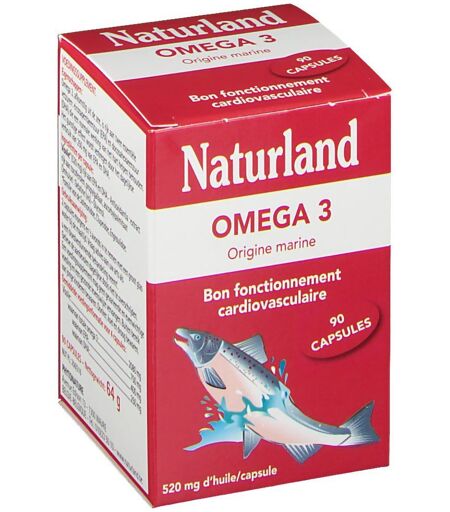 Complément alimentaire à utiliser dans le cadre d’une alimentation variée, équilibrée, d’un mode de vie sain. L'Oméga 3 d'origine marine est riche en deux acides gras essentiels: l'acide eicosapentaénoique (EPA) et l'acide docosahexaénoique (DHA) qui aident à maintenir une fonction cardiaque normale. L'effet bénéfique est obtenu par la consommation journalière minimale de 250 mg d'EPA et de DHA. Composition: Huile de poisson riche en EPA et DHA. Antioxydants: extrait riche en tocophérols, gallate de propyle, palmitate d'ascorbyle, Enveloppe: Gélatine (poisson), Glycérol. Valeur nutritionelle: Pour 4 capsules % AJR* Huile de poisson 2080 mg dont oméga 3 750 mg dont EPA 400 mg dont DHA 250 mg *Apport journalier de référence Conseil d'utilisation: 2 capsules matin et soir à prendre avec un grand verre d'eau au moment des repas. Précautions d'emploi: Ne pas dépasser la dose journalière recommandée. Si vous êtes sous traitement anti-coagulant, demandez conseil à votre médecin. Ne pas laisser à la portée des jeunes enfants. À conserver à l'abri de la chaleur, de la lumière et de l'humidité. Poids net: 64 g = 90 capsules Fabricant: NATURLAND - LHS BP 706 06511 CARROS CEDEX ...