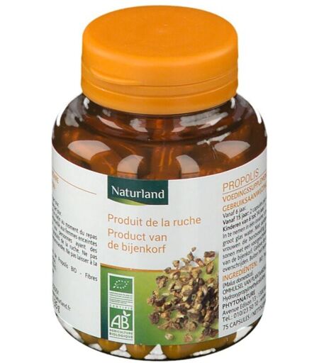 Complément alimentaire à utiliser dans le cadre d’une alimentation variée, équilibrée et d’un mode de vie sain.Complément alimentaire à base du produit de la rucheComposition:Extrait de Propolis BIO : Fibres de Pomme BIO (Malus domestica).ENVELOPPE D’ORIGINE VÉGÉTALE : Hydroxypropylméthylcellulose.Valeur nutritionelle: Pour 1 gélulePour 2 gélulesExtrait de Propolis342 mg684 mgConcentration en polyphénols totaux 17,5 mg35 mgConseil d'utilisation:À partir de 6 ans.À partir de 15 ans : 2 gélules par jour.Enfants de 6 à 14 ans : 1 gélule par jour.À prendre en une seule prise le matin au moment du repas avec un grand verre d’eau. Précautions d'emploi:Déconseillé aux femmes enceintes ou allaitantes. Déconseillé aux personnes ayant des antécédents d’allergies aux produits de la ruche. Ne pas dépasser la dose journalière recommandée. Ne pas laisser à la portée des jeunes enfants. À conserver à l’abri de la lumière, de la chaleur et de l’humidité.Poids net:35 g = 75 végécaps®Fabricant:LHS-NATURLAND1re avenue - 9e rue ...