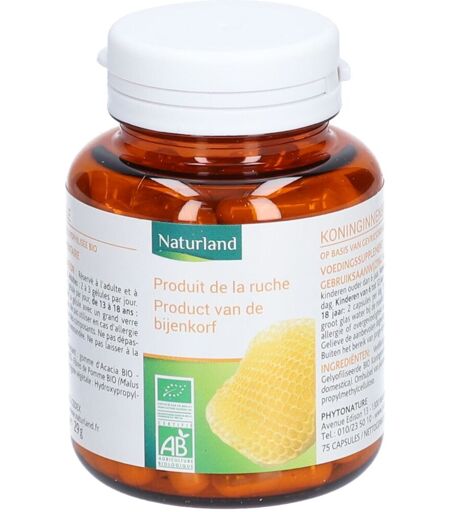 Complément alimentaire à utiliser dans le cadre d’une alimentation variée, équilibrée et d’un mode de vie sain.La gelée royale, véritable trésor de la ruche, est une substance sécrétée par les jeunes abeilles nourricières. elle constitue le régime alimentaire exclusif des reines durant toute leur existence, leur conférant une longévité jusqu’à 50 fois supérieure à celle de leurs congénères.*une charte unique d’apiculture responsable issu d’un partenariat équitable exclusif et éthique basé sur la préservation des abeilles et de la biodiversité pour une gelée royale premium à la traçabilité garantie.IngrédientsÉpaississant : gomme d’Acacia BIO - Gelée royale lyophilisée BIO* - Fibres de Pomme BIO (Malus domestica).ENVELOPPE D’ORIGINE VÉGÉTALE : Hydroxypropylméthylcellulose.*3 gélules apportent 168 mg de Gelée royale lyophilisée équivalant à 504 mg de Gelée royale.Valeurs nutritionnellespour 1 gélule / 3 gélulesGelée royale lyophilisée : 56 mg / 168 mgConseils d'utilisationRéservé à l’adulte et à l’enfant de plus de 6 ans.Adultes : 2 à 3 gélules par jour.Enfants de 6 à 12 ans : 1 gélule par jour,de 13 à 18 ans : 2 gélules par jour.Avaler la gélule avec un grand verre d’eau au moment du repas.Précautions d'emploiNe pas utiliser en cas d’allergie ou d’hypersensibilité à l’un des composants. Ne pas dépasser la dose journalière recommandée. Un complément alimentaire ne doit pas se substituer à une alimentation variée et équilibrée et à un mode de vie sain. Ne pas laisser à la portée des jeunes enfants. À conserver à l’abri de la lumière, de la chaleur et de l’humidité.Poids net75 gélulesAdresse du FabricantLHS-NATURLAND ZI - 1re avenue9e rue 06511 Carros Cedex ...