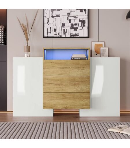 Fortuna Lai - Buffet moderne 140x30x77.5cm - lumineux led multicolores - Armoire de rangement couleur Blanc brillant et couleur bois