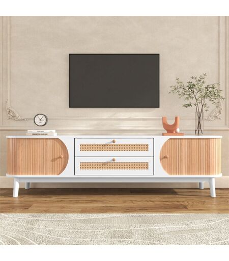 Fortuna Lai - Meuble tv 170x39.5x46cm - Meuble tv en bois avec portes et tiroirs en rotin style maison de campagne pour rangement - Blanc