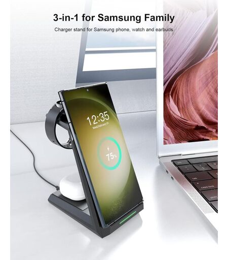 Station de chargement sans fil 3 en 1 Ce chargeur sans fil Samsung amélioré peut charger simultanément un téléphone Samsung, une montre Galaxy et des Galaxy Buds Pro. Le chargeur Samsung tout-en-un est idéal pour une utilisation à la maison et au bureau, car il élimine les cordons emmêlés et garde votre bureau épuré. Fonctionne avec la plupart des types de coques d'une épaisseur inférieure à 0,2 pouces comme les coques en caoutchouc/plastique/TPU/PC. Cadeau optimal pour votre famille et vos am Chargeur de téléphone sans fil avec adaptateur Le bloc de charge rapide QC3.0 équipé offre un meilleur effet de charge, également compatible avec davantage de périphériques USB à portée de main. La conception ergonomique du support de téléphone peut charger votre téléphone verticalement ou horizontalement, profiter de films et de musique sans interruption, répondre à un appel, lire des livres électroniques, envoyer des mes s sans avoir à le débrancher. Un meilleur accessoire de téléphone por Compatible avec plusieurs appareils La station de chargement de téléphone sans fil a une compatibilité universelle pour plus d'appareils Qi. Téléphones Samsung Galaxy Z Flip/Fold/S24/S23 Ultra/S22+/S21/S20 fe/Note 20/10 ; iPhone 14 Pro /13 Pro/12/11/XR/XS/X/8 Plus. Écouteurs sans fil Galaxy Buds/Buds Pro/Live ; AirPods 3/Pro/2 avec étui de chargement sans fil. Montres uniquement pour Galaxy Watch 5/5 Pro/4/3 (Attention pas pour Apple Watch). Chargement sûr et fiable Le chargeur sans fil ADADPU est doté d'un contrôle de température, d'une protection contre les surcharges, d'une protection contre les surintensités et les surtensions et d'une détection d'objets ét, vous offrant une charge sans fil sûre. L'indicateur LED intelligent s'allumera pendant 10 secondes lors de la charge, puis s'éteindra pendant le processus de charge, sans lumière dérangeante pour votre doux sommeil. Les produits internationaux ont des conditions de vente distinctes, sont vendus depuis l'étranger et peuvent différer des produits locaux, y compris la taille, la classe d'âge, et la langue du produit, de l'étiquetage ou des notices. En savoir plus sur Global Store. ...