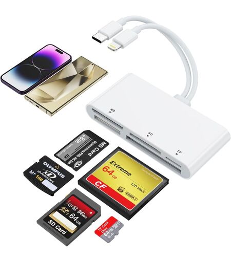 ¿ Lecteur multi-cartes 5 en 1 Ce lecteur de cartes polyvalent prend en charge plusieurs types de cartes, y compris SD, , XD, MS et Micro SD (TF). Permet la lecture et l'écriture simultanées sur un imum de 5 cartes différentes, augmentant considérablement la productivité. Design à double interface équipé de ports Lightning et USB-C, ce lecteur de carte offre une connectivité sans interruption à votre ordinateur portable, tablette et smartphone. Il est plug-and-play sans besoin de pilotes supplémentaires et prend en charge une large gamme de systèmes d'exploitation, y compris Mac OS, iOS, Android, Linux, Ch OS et Windows XP/Vista/7/8/8.1/10/11. Transfert de données à haute vitesse profitez de vitesses de transfert de données rapides jusqu'à 5 Gbps via USB-C, ce qui vous permet de déplacer rapidement des photos, des vidéos et d'autres fichiers de vos cartes vers votre ordinateur. Ce lecteur de carte USB 3.0 est également rétrocompatible avec les ports USB 2.0/1.1, assurant une grande compatibilité avec les appareils plus anciens. Large compatibilité avec les appareils Ce lecteur de carte universel fonctionne avec une variété d'appareils, y compris iPhone 15/15 Pro /14/14 Pro/13/13 Pro/12/12 Pro/11/11 Pro/XS/XS /XR/8/7, iPad Air, iPad mini, Samsung Galaxy S10/S9/S8/Note 9/8, LG G5/8/5/5/5/5/5/G6/V2. 0, Google Pixel, Nexus 5X/6P, MacBook Air/Pro, Surface Pro 9/8, Huawei P9/10, Lumia 950/950 XL, Moto Z et plus encore. Durable et fiable fabriqué avec des matériaux de haute qualité et rigoureusement testé pour la durabilité, ce lecteur de cartes est conçu pour durer. Nous le soutenons avec une garantie sans soucis de 12 mois et un service client dédié pour garantir votre satisfaction complète. ...