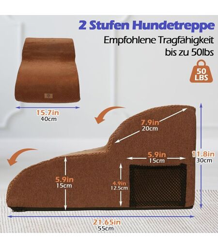 Escalier Pour Chien À 2 Marches,Rampe Prolongée,Pour Petits Chiens Et Chats,En Mousse Haute Densité,Pour Lit Et Canapé,Portable,Avec Housse Lavable (Marron)
