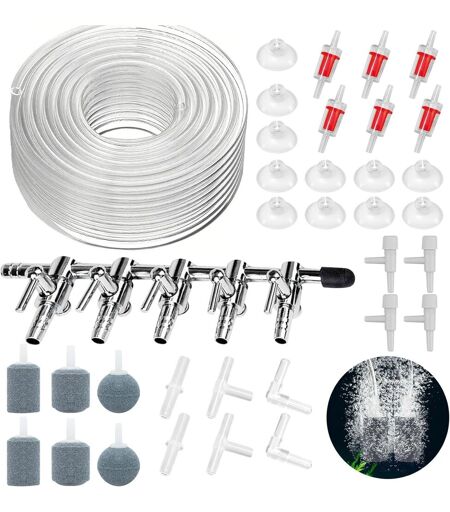 66pcs Accessoires De Pompe À Air Pour Aquarium,5 Voies Séparateur De Flux D'air,10m Air Line Tube Tuyau,Pierre À Air,Valves Anti-Retour,Ventouse,Valves De Contrôle Et I/T/L Connecteurs