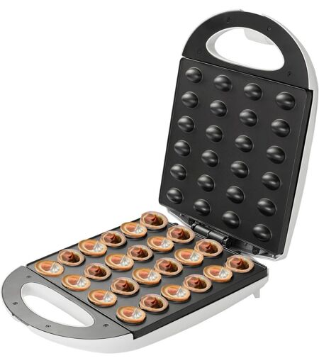 Dispositif pour la cuisson de biscuits sous forme de noix fourrées à la crème selon le goût sucré ou sec La taille XL vous permet de cuire jusqu'à 24 demi-cacahuètes en un cycle Le boîtier en bakélite, les poignées isolées thermiquement et le revêtement antiadhésif de la table de cuisson rendent le produit confortable Puissance élevée, cuisson imale de 1 600 W pour un lot de biscuits, jusqu'à 2 minutes. ...