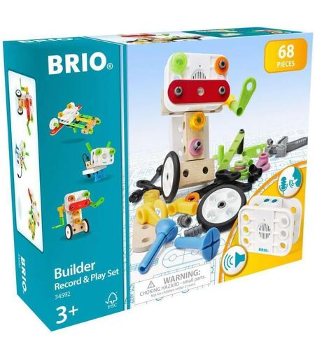 PERSONNAL Z VOS CONSTRUCTIONS AVEC VOTRE PROPRE VOIX Grâce à ce coffre, constru z un robot, un avion ou tout modèle de votre choix. Appuyez sur le bouton d'enregistrement et parler/chanter. Pour écouter vos enregistrements, appuyez sur le bouton de lecture. Inclus 1 livret d'inspirations. Coffret de 68 pièces, piles LR44 fournies DEVELOPPE L'IMAGINATION ET L'INGÉNUOSITÉ Un jeu de construction amusant et créatif pour stimuler l'imagination, la motricité fine et la coordination mains / yeux. Parfait pour stimuler l'apprentis dans les domaines des sciences, de la technologie, de l'ingénierie et des mathématiques (STEM), dès 3 ans EXTENSIBLE A VOLONTE Elargissez les possibilités de construction en complétant ce coffret avec l'une des autres références de la collection BRIO Builder (moteur, lumière, ...). Tous les composants sont compatibles entre eux et augmentent les possibilités de construction UN CADEAU INTEMPOREL qui fera des heureux pour des heures de jeu et damusement seul ou à plusieurs ! En bois de haute qualité ultra solide, ne se déforme pas, sans écharde et qui résiste à lhumidité. Pour un anniversaire ou pour Noel ou une autre fête. Dès 3 ans HAUTE QUALITÉ Fabriqué à partir de bois de hêtre certifié FSC et de plastique de haute qualité. FSC organisme à but non lucratif qui protège, contrôle et encourage la gestion durable des forêts. Avec outils à taille de mains d'enfant pour un assemblage facile Attention Afin d'éviter tout risque détranglement, ôter le jouet dès que l'enfant tente de se mettre à quatre pattes ou de ramper Attention Contient un jouet. La surveillance d'un adulte est recommandée Attention Réservé à un u domestique ...