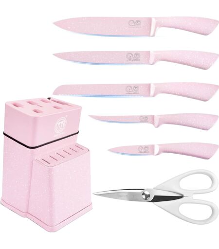 Knife Block Set,Pink Color,Stainless Steel Kitchen Knives With Knife Block Holder,Meat Cleaver,Professional Cooking Slicing Knife Kit For Master Chef,Kitchen Cutlery