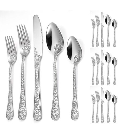 Vintage Sculpture Cuisine En Acier Inoxydable Argenterie Vaisselle Couverts Couverts Couteaux Fourchettes Cuillères Ensemble Maison Couteau À Steak Cuillère À Dessert (Argent,20 Pièces)
