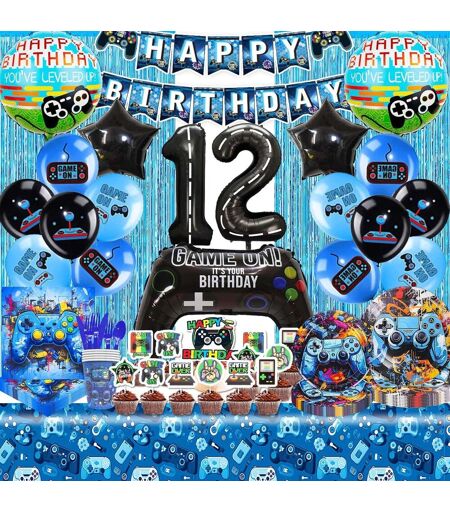 119 Pièces Anniversaire Gamer 12 Ans,2025 Nouveau Bleu Decoration Anniversaire Garçon,Video Jeu Birthday Banner,Gaming Party Decorations Gobelets Ballons,Serviettes(Deco Gamer 12 Ans¿