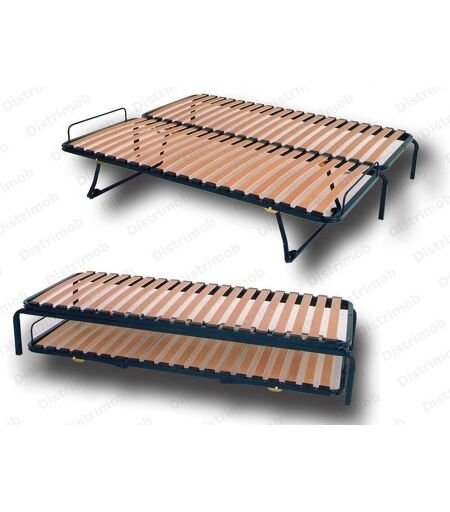 - Suspension : 20 lattes bois multiplis- Nombre de lattes : 20 lattes sur la partie supérieure et sur la partie inférieure.- Fixation des lattes : embouts polyéthylène noir- Largeur des lattes : 53x8mm.- Cadre en métal laqué époxy coloris bleu nuit.- Épaisseur hors tout du cadre : 4,5cm pour la partie supérieure et 9.5cm pour la partie inférieure avec les pieds pliés.- Hauteur 35cm levé pour les 2 sommiers.- Longueur 195cm pour la partie supérieure- Longueur 188cm pour la partie inférieure- Partie inférieure équipée de roulettes + 2 arrêts matelas.- épaisseur maxi du matelas pour la partie inférieure: 17cm - Existe en dimensions 70x190, 80x190 et 90x190 .- Partie inférieure seule disponible également à la vente.- Fabrication françaiseVendu sans les matelas. Suggestion de présentation ...
