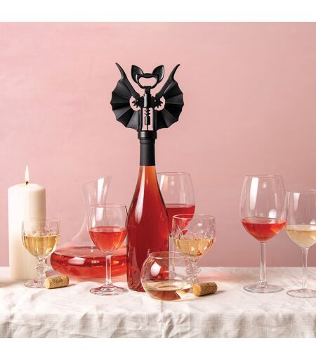 Tire-bouchon et décapsuleur chauve-souris; Ouvrez la bouteille et la nuit peut venir; Matériau : métal, silicone; Dimensions tire-bouchon environ 7,5 x 3,5 x 14,5 cm, ouvert environ 19 cm de large ; emballage environ 17 x 4,5 x 22 cm; Poids environ 270 grammes; Ne convient pas au lave-vaisselle ou au micro-ondes; ...