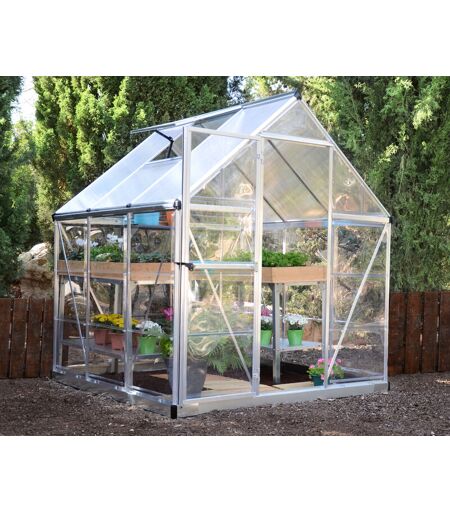DESCRIPTION GÉNÉRALE La serre de jardin en polycarbonate Hybrid 2,33 m² est parfaite pour les petits jardins. Elle permet de faire pousser des semis, des plantes exotiques ou d'aménager un coin potager. Sa structure en aluminium est robuste et résistante à la rouille, tandis que les panneaux de polycarbonate à double paroi protègent contre une forte exposition au soleil. Ces panneaux offrent plus de 90% de transmission lumineuse, sont traités anti-UV et pratiquement incassables. La serre est facile à installer et ne nécessite pas d'entretien particulier. SPÉCIFICATIONS TECHNIQUES Dimensions extérieures (L x l x H) : 126 x 185 x 208 cm Dimensions intérieures (L x l x H) : 120 x 181 x 204 cm Surface extérieure : 2,3 m² Surface intérieure : 2,17 m² Poids net : 26,49 kg Épaisseur du polycarbonate : Toit : 4 mm, Parois : 0,7 mm Structure : aluminium Matière des parois : polycarbonate transparent Coloris : aluminium naturel Capacité de charge : jusqu'à 75 kg/m² de neige Montage facile avec ...