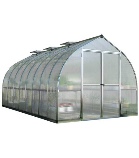 Palram - Canopia serre aluminium Bella 816 Argent 489x244x219 cm Exclusive, individuelle, fonctionnelle ! La serre Bella de Palram — ; Canopia convainc par sa forme d'oignon exceptionnelle, un cadre en aluminium massif plus une fondation en acier, et des panneaux à double paroi en polycarbonate de 6 mm d'épaisseur. Une valeur ajoutée pour ton jardin — ; Bella fait honneur à son nom, et pas seulement en raison de son aspect particulier ! La serre innovante Bella de Palram - Canopia allie un design de serre insolite à une fonctionnalité optimale. Un socle en acier constitue la base solide du cadre stable en aluminium, les deux composants nécessitent peu d'entretien et sont résistants à la corrosion. Le vitrage de la serre est entièrement constitué de panneaux en polycarbonate de haute qualité. Ces panneaux sont non seulement très résistants à la rupture, mais ils offrent également à tes plantes une protection à 100 % contre les UV et une diffusion optimale de la lumière. ...