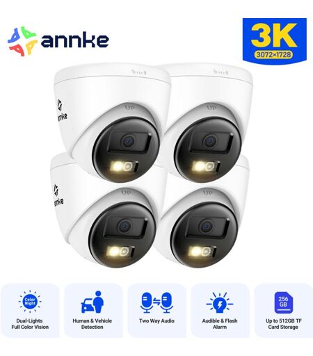 ANNKE 4PCS Caméra PoE 3K,caméras de surveillance 3K sécurité à domicile, détection humaine ia, vision nocturne intelligente à double lumière,audio