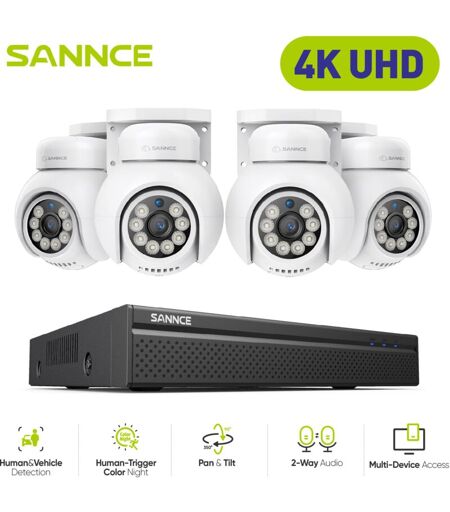 SANNCE 4K Sistema di telecamere di sicurezza PT PoE,4 telecamere IP PT,audio bidirezionale, videosorveglianza 24/7,0TB HDD