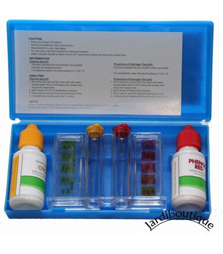 teste analyse de votre eau de piscine. Teste eau piscine. (bouteilles de test ph + cl) pour déterminer le ph et la teneur en chlore. Caractéristiques : Phenol Roure/rouge : Solution d'indicateur pour test d'hydrogène (PH). Contenance : 20 ml. Orthotolidine OTO : Solution indicateur pour test de chlore (CL) Contenance : 20 ml. Kit de test de qualité de l'eau. Test de chlore (CL) et test d'hydrogène (PH). Avec une boîte en plastique, facile à ranger. Pratique et pratique, facile à transporter. Test de chlore (CL) Informations : 1. Comparez votre lecture avec les valeurs de l'échelle. 2. Les valeurs d'échelle représentées par un nombre indiquent la quantité de chlore associée à l'eau. 3. Pour un traitement efficace, la lecture doit être comprise entre 1,0 et 1,5. Informations : 1. Rincer le flacon d'essai et remplir à la marque avec un échantillon d'eau. 2. Ajoutez 4 gouttes de solution OTO (orthotolidine). 3. Placez le bouchon sur le flacon et agitez pour mélanger. 4. Comparez votre ...