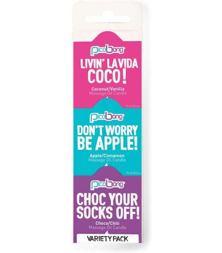 Vous cherchez une nouvelle façon amusante de faire monter la température ? Laissez les nouvelles bougies de massage PicoBong vous montrer le chemin ! Les Bougies de Massage PicoBong sont disponibles en 3 parfums alléchants. Vous pouvez ainsi faire varier les parfums selon votre humeur... Ce Pack de 3 Bougies de Massage est idéal pour découvrir les différents parfums inédits proposés par PicoBong. La cire des Bougies de Massage PicoBong devient une huile de massage onctueuse au fur et à mesure que celle-ci fond. Une fois que vous pensez avoir suffisament d'huile, il n'y a qu'à souffler sur la flamme pour l'éteindre. Vous pouvez ensuite utiliser ce subtile mélange tiède sur le corps de votre partenaire pour des massages très sensuelles et faire ainsi monter l'excitation. 3 Parfums à découvrir : * Noix de Coco et Vanille * Pomme et Cannelle * Chocolat et Chili Vos Bougies de Massage PicoBong sont fabriquées à partir de cire de soja entièrement naturelle, de beurre de karité et d'huile de noyau d'abricot. Ingrédients bougie coco-vanille : Glycine Soja (Soy) Wax, Butyrosperum Parkii (Shea Butter), Prunus Armeniaca (Apricot) Kernel Oil, Perfume (Aldehydec-18, Milk Lactione, Ethyl Vanillin, Decalactione). Ingrédients bougie pomme-cannelle : Glycine Soja (Soy) Wax, Butyrosperum Parkii (Shea Butter), Prunus Armeniaca(Apricot) Kernel Oil, Perfume (Vanillin, Maltol, Anisaldehyde). Ingrédients bougie choco-chili : Glycine Soja (Soy) Wax, Butyrosperum Parkii (Shea Butter), Prunus Armeniaca(Apricot) Kernel Oil, Perfume (Vanillin, Ethyl Hydroxypyrone, Butyrolactone). ...