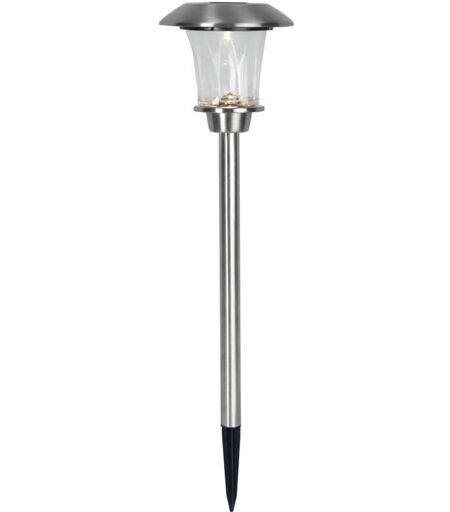 Lampe solaire de jardin Grenade, acier inoxydable, capteur crépusculaire, 48 cm x 15 cm La borne d'éclairage solaire LED GRANADA est composée d'une tige en acier inoxydable avec un piquet de terre noir. La tête de lampe légèrement en forme d'entonnoir se trouve en haut. Les LED intégrées émettent une agréable lumière blanc chaud et créent ainsi une ambiance chaleureuse. Il y a un panneau solaire sur la tête de la lampe, avec lequel la batterie intégrée peut être facilement rechargée. Grâce au capteur crépusculaire, la lampe solaire s'allume et s'éteint également automatiquement. Avec une hauteur de 48 cm et une largeur de 15 cm, le luminaire de chemin est idéal comme élément décoratif élégant pour une utilisation en extérieur, que ce soit dans le parterre de fleurs, au bord du chemin pour un éclairage sûr ou pour mettre en valeur certains éléments du jardin. La batterie rechargeable est incluse. ...