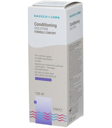 La solution Bausch & Lomb Conditioning Solution Formule confort nettoie, décontamine et déprotéinise les lentilles rigides et les lentilles de contact rigides perméables aux gaz.Bénéfices Elle dépose un fil protecteur à la surface de la lentille qui améliore et maintient l'hydratation de la lentille tout au long de la journée. Elle diminue également les frictions entre la cornée et la paupière en éliminant les particules responsables d'irritation et d'inconfort. Conseils d'utilisationLire attentivement la notice CompositionDécontaminant polyaminopropyl biguanide (0,0005 % w/v), gluconate de chlorexidine (0,003 % w/v), edetatedisodique (0,05 % p/v). Autres : agents tampons et de tonicité, polyquaternium 10, viscosifiant cellulosique, alcool polyvinylique, dérivé dupolyethylène glycolIndicationsS'utilise après le nettoyage des lentilles rigides perméables aux gaz en fluorosilicone acrylate, en silicone agrylate et à traitement de surface. Elle est aussi indiquée pour les lentilles PMMA.ConditionnementFlacon de 120 ml ...