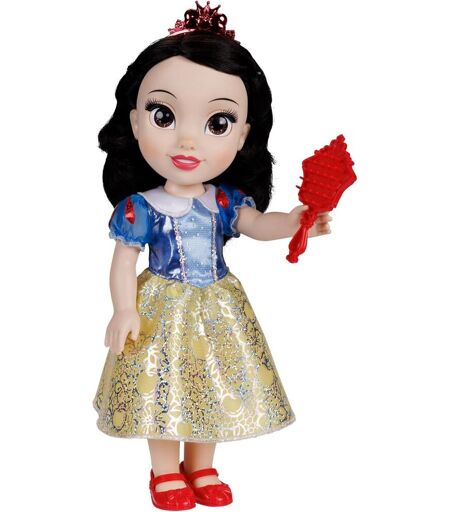 POUPÉE BLANCHE NEIGE OFFICIELLE DISNEY \u2013 Cette magnifique poupée de 38 cm représente Blanche Neige, la première princesse de l'univers Disney. Les enfants retrouveront chaque détail iconique de ce personnage bien-aimé, de son visage doux et amical à ses cheveux noirs brillants, permettant de recréer des scènes du film ou d'inventer de nouvelles aventures dans la forêt enchantée. ROBE SOMPTUEUSE AVEC EFFETS ARGENTÉS \u2013 Blanche Neige est habillée d'une robe royale ornée de superbes détails argentés, reflétant parfaitement son style emblématique. Ces touches scintillantes ajoutent une touche de magie et d'élégance, capturant toute la splendeur du personnage et enchantant les jeunes fans. ACCESSOIRES INCLUS POUR UN JEU CRÉATIF \u2013 La poupée est accompagnée d'une brosse à cheveux, permettant aux enfants de coiffer les cheveux courts et soyeux de Blanche Neige. Cet accessoire interactif enrichit le jeu en offrant la possibilité de personnaliser ses coiffures et de prolonger le plaisir avec des scènes toujours plus variées. COLLECTION MON AMIE PRINCESSE \u2013 Cette poupée fait partie de la collection ""Mon Amie Princesse"", une série prestigieuse de poupées Disney qui met en valeur les plus grandes princesses de l'univers Disney. Idéale pour les collectionneurs comme pour les jeunes fans, elle permet de compléter une série incontournable de personnages féériques. CADEAU POUR LES ENFANTS DÈS 3 ANS \u2013 Cette poupée Blanche Neige est un cadeau parfait pour les enfants à partir de 3 ans. Que ce soit pour un anniversaire, Noël ou toute autre occasion spéciale, elle offre des heures de divertissement imaginatif et créatif, tout en invitant les enfants à revivre les aventures magiques de ""Blanche Neige et les Sept Nains. Attention:Contient un jouet. La surveillance d'un adulte est recommandée Attention:Ne convient pas aux enfants de moins de 3 ans. À utiliser sous la surveillance d'un adulte.La livraison depuis la France est prévue dans 5 jours ouvrés, n'hésitez pas à passer votre commande ...