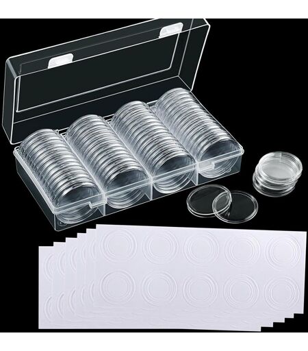 ¿Rangement Pieces de Monnaie Set¿ :Ce rangement pieces de monnaie 1 organisateur en plastique transparent, 60 boîtes de collecte de pièces et 60 joints en mousse EVA pour tous les types de pièces. Diamètre intérieur : 40mm, convient aux 17/20/25/27/30/33/38/40 monnaie de paris. ¿Rangement Pieces de Monnaie Concevoir¿ :La rangements pour pièces de monnaie est conçue avec une ouverture en forme de croissant sur le bord extérieur de chaque boîte ronde, ce qui la rend plus facile à ouvrir et très pratique à utiliser. Le fond et le couvercle s'ajustent étroitement et peuvent protéger efficacement vos pièces de monnaie. ¿Rangements pour Pièces de Monnaie¿:L'organisateur de pièces est livré avec des rondelles douces et flexibles en 8 tailles qui sont réglables, de sorte que vous pouvez choisir la bonne rondelle en fonction de la taille de vos pièces, de sorte que vous pouvez maintenir vos pièces en place, ce qui peut éviter le frottement des pièces les unes contre les autres et l'usure. ¿Classeur Piece 2 Euros¿:rangements pour pièces de monnaie transparent, très pratique pour présenter, ranger, voir et échanger des pièces de monnaie. Convient aux pièces de 2 euros, 1 euro,et autres. C'est le cadeau idéal pour les collectionneurs de pièces de monnaie. ¿Capsules de Monnaie¿:La rangement pieces de monnaie est fabriquée en plastique PS transparent de haute qualité. Elle est résistante à l'humidité, à la poussière, à la rouille, durable, avec des bords lisses, une grande transparence et une bonne étanchéité, ce qui permet de protéger fermement l'intérieur des pièces. Sa transparence vous permet de voir facilement ce qu'il y a à l'intérieur..La livraison depuis la France est prévue dans 5 jours ouvrés, n'hésitez pas à passer votre commande ...