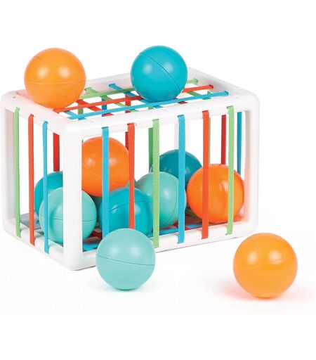 KALANKA-- Cube De Manipulation - Jouets D'Éveil Bébé - Dès 10 Mois - Développe La Réflexion, La Motricité Fine, Le Toucher & La Découverte - 1 Cube Élastique + 12 Balles Oranges & Bleues Au Son Rigol