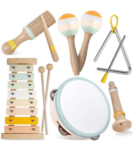 Ensemble d'instruments de musique pour tout-petits : Notre ensemble d'instruments de musique pour tout-petits est spécialement conçu pour les bébés qui aiment les instruments de musique Montessori. Ces jolis jouets en bois Montessori favorisent le développement des compétences motrices fines. De plus, ces jouets musicaux pour enfants de 1 à 3 ans sont fabriqués avec des matériaux de haute qualité qui sont sûrs pour vos enfants. Notre ensemble d'instruments de musique pour enfants est également parfait pour les parents avec un bébé moderne. Apprentissage précoce avec des instruments Montessori : Nos jouets musicaux pour bébés et xylophone pour les enfants de 1 à 3 ans sont parfaits pour développer le rythme et les compétences musicales. L'ensemble d'instruments stimule le sens de la vue, de l'ouïe et du toucher des enfants. Il aidera à cultiver la sensibilité des enfants à la musique et à la perception du rythme, à améliorer la créativité et la capacité à distinguer les instruments, et à développer les intérêts des enfants. Jouets en bois aux tons neutres : Les jouets musicaux pour tout-petits sont conçus avec des couleurs neutres qui plairont aux parents minimalistes qui recherchent des jouets pour enfants au look naturel. Nos jouets musicaux pour tout-petits peuvent être utilisés comme décoration de salle de jeux et de chambre d'enfant. Ils s'intègrent parfaitement dans une salle de jeux boho ou une chambre d'enfant boho ! Ils se marient avec tous les jouets pour bébés boho, les articles pour bébés neutres, les articles pour bébés neutres en termes de genre et les jouets esthétiques pour bébés. Ils seront un bel élément dans une salle de jeux moderne. Jouets musicaux sûrs et sains pour les tout-petits : Nos jouets musicaux pour bébés, y compris le xylophone Montessori et le set de percussions pour les enfants de 1 à 3 ans, sont fabriqués en bois d'aulne durable avec des touches de piano en acier. Ces premiers instruments de musique pour bébés sont non seulement robustes, mais aussi sûrs, fabriqués avec des matériaux sans BPA et une peinture sans plomb, et ont passé la certification CPC&CPSIA,; ils sont non toxiques et adaptés aux jeunes enfants. Meilleur cadeau éducatif Montessori précoce pour les enfants de 1-2-3 ans et plus : C'est le premier instrument de musique d'un bébé. Les enfants peuvent entendre différents sons en utilisant différents instruments. Cela favorise l'interaction entre les parents et les enfants en jouant avec des jouets pour tout-petits, stimule les capacités cérébrales du bébé et renforce la relation avec les parents. Notre ensemble d'instruments de musique en bois est absolument le meilleur parmi les jouets éducatifs pour l'apprentissage précoce que vous connaissez. C'est aussi un choix de cadeau idéal pour Noël ou un anniversaire. Attention:Ne convient pas aux enfants de moins de 3 ans. À utiliser sous la surveillance d'un adulte Attention:Réservé à un usage domestique Attention:À n'utiliser qu'en eau où l'enfant a pied... ...