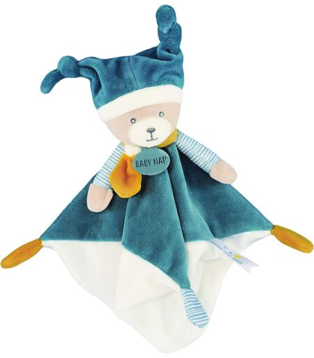 KALANKA-BABY NAT' - Doudou Polochon Ourson Mignon - Bleu - Ours avec Bonnet de Nuit & Imprimé Rayé - Idée Cadeau Naissance - Doudou Facile à Attraper - Tout Doux pour les Câlins - BN0739