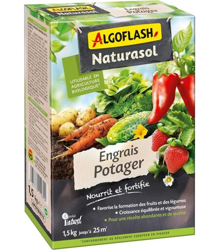 Engrais sous forme de granulés pour favoriser la croissance et des récoltes abondantes au potager, Idéal pour toutes les variétés de fruits et légumes (tomates, concombres, pommes de terre, carottes, radis, salades, ...) Dosage simple et précis grâce à la dosette graduée Nutri-Dose incluse et aux doses d¿emploi à l¿arrière de l¿emballage, Pour jusqu¿à 25 m² de surface, Enfouissement de l¿engrais par griffage et arrosage Pratique, à la plantation ou en entretien, Utilisable en Agriculture Biologique ( Conformément au règlement CE n°834/2007 ) Formule à base d¿engrais NPK (azote, phosphore et potassium) pour une alimentation saine, riche, complète et équilibrée. ENGRAIS NF U 42-001. Composition: NPK 4.8.10, 3% MgO, 16,3% SO3 Contenu: 1 x Engrais Potager, ALGOFLASH NATURASOL, APOTBIO15, Poids: 1.5 kg, Dimensions (L x P x H) : 18,4 x 6,4 x 22 cm.La livraison depuis la France est prévue dans 5 jours ouvrés, n'hésitez pas à passer votre commande ...
