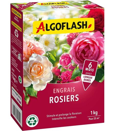 Engrais en granulés pour favoriser et prolonger la floraison ainsi qu\u2019intensifier les couleurs, Idéal pour toutes les variétés de rosiers (en massif, arbustes, grimpants...) ainsi que les arbustes à fleurs en pots ou en pleine terre Facile à utiliser et doser grâce à la Nutri-dose graduée et aux doses d\u2019emploi indiquées au dos du produit, Jusqu'à 25 m². S'utilise en épandage au pied de la plante, Période de fertilisation recommandée : de mars à mai et de septembre à novembre Pratique, Action longue durée jusqu\u2019à 6 mois en 1 application, Longue conservation du produit grâce à la fermeture ZIP du sachet Sa formule complète leur apporte une alimentation saine, riche et complète. Composition : NPK 10.5.6 avec oligo-éléments. ENGRAIS CE Contenu : 1 x ALGOFLASH Engrais Longue Durée pour Rosiers, 1 kg, ROS1N.La livraison depuis la France est prévue dans 5 jours ouvrés, n'hésitez pas à passer votre commande ...