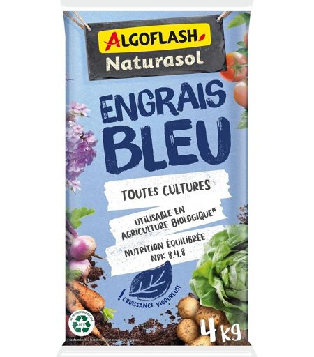 Engrais complet sous forme de granulés pour des récoltes abondantes, savoureuses et de qualité, Idéal pour toutes cultures : toutes les variétés de légumes, petits fruits, arbres fruitiers et d\u2019ornement, rosiers, fleurs et gazon Engrais Bleu organo-minéral, l'original revisité maintenant en version Utilisable en Agriculture Biologique (conformément à la réglementation européenne en vigueur). De plus, il agit durablement en stimulant la vie des micro-organismes du sol Sa couleur bleue permet un meilleur contrôle de l\u2019épandage, limitant le risque de fertilisation aléatoire S'utilise à la plantation, au printemps en entretien et à l'automne. Période de fertilisation conseillée de mai à octobre Conçu dans une optique de développement durable, Formule exclusive spécialement adaptée aux besoins des plantes, pour une alimentation saine, riche et complète. Composition : NPK 8.4.8. ENGRAIS ORGANO-MINERAL Contenu : 1 x Algoflash Naturasol Engrais Bleu , Utilisable en Agriculture Biologique, pour Toutes Cultures, 4 kg, ABIOBLEU4.La livraison depuis la France est prévue dans 5 jours ouvrés, n'hésitez pas à passer votre commande ...