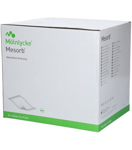 Mesorb® est un pansement souple et très absorbant qui possède une grande capacité de rétention pour une bonne gestion des exsudats. Le support hydrophobe empêche la contamination extérieure de la plaie et protège les vêtements et le linge de lit de la pénétration de l'exsudat. Comme le support recouvre les côtés du pansement, il empêche également les fuites latérales. Grande capacité d'absorption et de rétention pour une bonne gestion des exsudats La barrière anti-perforation empêche les fuites et la contamination extérieure. Procure une sensation de douceur Respirant Conseil d'utilisation Appliquer sur les plaies bien nettoyer. ...