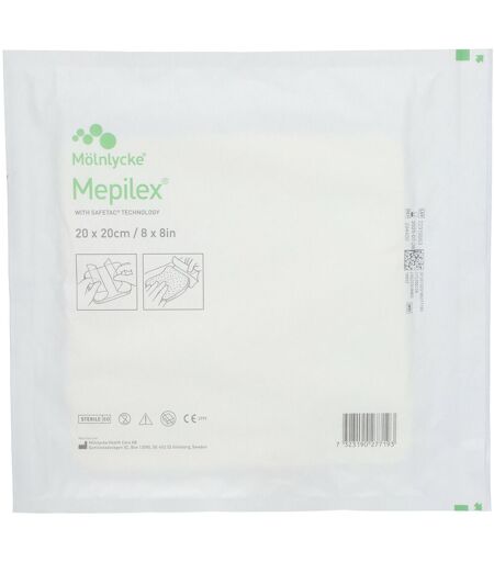 Taille du pansement:20 x 20 cmIndication:Mepilex® est conçu pour le traitement des plaies exsudatives. Vous pouvez adapter la taille de Mepilex® en le découpant pour correspondre à la localisation et la taille de la plaie. Cela en fait un pansement adapté pour les régions difficiles à traiter. Vous pouvez utiliser Mepilex avec notre système de fixation Tubifast™ .Doux et souple, ce qui le rend facile à utiliser et polyvalent.Moins de douleur lors du changement de pansementFerme les bords de la plaie pour éviter la macération. Gestion efficace de l'exsudat Description du produit:Mepilex est un pansement en mousse absorbante pour le traitement d'une large gamme de plaies chroniques et aiguës. Les propriétés hautement absorbantes assurent une prise en charge efficace de l'exsudat de la plaie. Chaque pansement Mepilex est doté de Safetac, une couche de contact en silicone qui minimise la douleur. Il est donc facile de retirer le pansement sans endommager la peau. De plus, Safetac scelle les bords de la plaie pour protéger la peau des dommages causés par les fuites et la macération. Mepilex peut être coupé sur mesure selon les besoins.Conseils d'utilisation:Avant d'appliquer le pansement, nettoyez systématiquement la plaie. Le pansement doit recouvrir le lit de la plaie en dépassant d'au moins 2 cm sur la peau périlésionnelle. Utilisez Tubifast lorsqu'une fixation est nécessaire.Conditionnement5 pansements ...