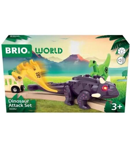 Écrasez tout sur votre passage avec le 36082 Coffret Attaque Dinosaure. Placé au-dessus des rails en bois BRIO, le puissant dinosaure prend vie avec ses yeux illuminés en rouge et ses rugissements activés par le mouvement. ...