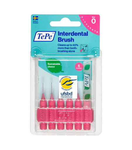 Les brossettes interdentaires TePe sont conçues pour nettoyer les espaces entre les dents inatteignables avec une brosse à dents classique. Pour des dents et des gencives fraiches chaque jour. Les brossettes interdentaires TePe sont disponibles en plusieurs tailles (certifiées ISO), modèles et types de filaments. Elles sont fabriquées en Suède. L'usage quotidien peut éliminer 40% de plaque en plus d'un simple brossage et permet de prévenir les caries, les saignements causés par les maladies des gencives et la mauvaise haleine. Ces brossettes sont éco-responsables, fabriquées en bioplastique. En remplacant les matières premières fossiles par une matière naturelle, l'huile de pin, nous avons réduit notre empreinte carbone de nos brossettes interdentaires de 80% - sans compromettre la qualité, l'efficacité ou le design du produit. Fil métallique recouvert de plastique, et recouvert de brins sur toute sa longueur.Un design fonctionnel, un manche ergonomique et un cou flexible pour accéder aux zones les plus compliquées. Adaptées à une utilisation avec un implant, appareil dentaire, couronnes, et bien sur vos dents naturelles. Couleur : rose Taille ISO : 0 DIamètre du fil (mm) : 0,4 PHD (mm) : 0,6 ...