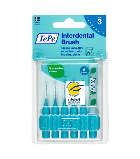 Les brossettes interdentaires TePe sont conçues pour nettoyer les espaces entre les dents inatteignables avec une brosse à dents classique. Pour des dents et des gencives fraiches chaque jour. Les brossettes interdentaires TePe sont disponibles en plusieurs tailles (certifiées ISO), modèles et types de filaments. Elles sont fabriquées en Suède. L'usage quotidien peut éliminer 40% de plaque en plus d'un simple brossage et permet de prévenir les caries, les saignements causés par les maladies des gencives et la mauvaise haleine. Ces brossettes sont éco-responsables, fabriquées en bioplastique. En remplacant les matières premières fossiles par une matière naturelle, l'huile de pin, nous avons réduit notre empreinte carbone de nos brossettes interdentaires de 80% - sans compromettre la qualité, l'efficacité ou le design du produit. Fil métallique recouvert de plastique, et recouvert de brins sur toute sa longueur.Un design fonctionnel, un manche ergonomique et un cou flexible pour accéder aux zones les plus compliquées. Adaptées à une utilisation avec un implant, appareil dentaire, couronnes, et bien sur vos dents naturelles. Couleur : bleue Taille ISO : 3 DIamètre du fil (mm) : 0,6 PHD (mm) : 1,1 ...