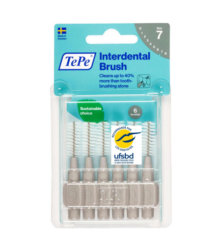Les brossettes interdentaires TePe sont conçues pour nettoyer les espaces entre les dents inatteignables avec une brosse à dents classique. Pour des dents et des gencives fraiches chaque jour. Les brossettes interdentaires TePe sont disponibles en plusieurs tailles (certifiées ISO), modèles et types de filaments. Elles sont fabriquées en Suède. L'usage quotidien peut éliminer 40% de plaque en plus d'un simple brossage et permet de prévenir les caries, les saignements causés par les maladies des gencives et la mauvaise haleine. Ces brossettes sont éco-responsables, fabriquées en bioplastique. En remplacant les matières premières fossiles par une matière naturelle, l'huile de pin, nous avons réduit notre empreinte carbone de nos brossettes interdentaires de 80% - sans compromettre la qualité, l'efficacité ou le design du produit. Fil métallique recouvert de plastique, et recouvert de brins sur toute sa longueur.Un design fonctionnel, un manche ergonomique et un cou flexible pour accéder aux zones les plus compliquées. Adaptées à une utilisation avec un implant, appareil dentaire, couronnes, et bien sur vos dents naturelles. Couleur : gris Taille ISO : 7 DIamètre du fil (mm) : 1,3 PHD (mm) : 2,6 ...