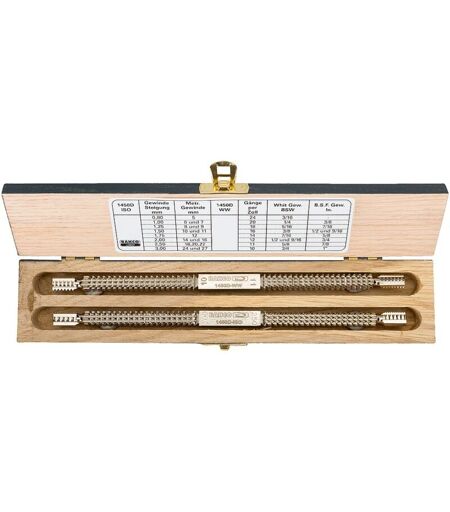 Bahco - Jeu de 2 limes à fileter dans un coffret en bois - 1450D/2 - Pour restaurer les filets intérieurs et extérieurs - Huit pas de filets métriques et huit pas de filets en pouces - Avec table des filets - Dans un coffret en bois Caractéristiques techniques : Dimensions du colis : 40 x 70 x 270 mm Type de boulon : M5-M27 Type de boulon : BSF 3/16-3/4 BSW 3/8-1" Poids : 440 g ...