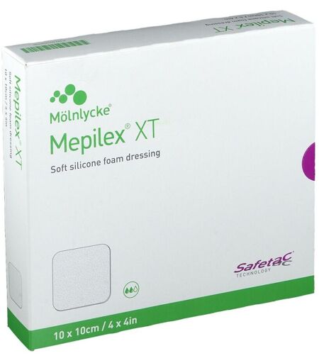 Taille du pansement:10 x 10 cm Indications:Mepilex® XT convient à une plus grande variété de plaies exsudatives aigües et chroniques à tous les stades de cicatrisation. Description du produit:Mepilex® XT est un pansement de mousse doux et extrêmement conformable avec canaux de drainage qui peuvent efficacement absorber une plus grande variété d’exsudats et maintenir la plaie hydratée. La couche Safetac® scelle le pourtour de la plaie, prévient les fuites d’exsudat sur la peau péri-lésionnelle, réduisant ainsi le risque de macération. Elle permet également de remplacer le pansement sans dégrader la plaie ou la peau péri-lésionnelle, ni exposer le patient à des douleurs additionnelles. Conseils d'utilisation:1. Nettoyer la plaie selon les procédures habituelles. Sécher soigneusement la peau périlésionnelle. Pour de meilleurs résultats, Mepilex® XT doit dépasser lapeau périlésionnelle d’au moins 1 à 2 cm. 2. Retirer les feuillets protecteurs et appliquer la face adhésive du pansement sur la plaie. Ne pas étirer. 3. Au besoin, fixer Mepilex® XT avec un bandage ou un autre produit de fixation. Mepilex® XT peut demeurer en place plusieurs jours, selon l’état de la plaie et de la peau périlésionnelle. ...